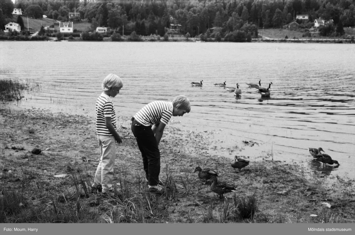 Fåglar vid Talluddens badplats, Västra Ingsjön i Lindome, år 1983. "Det finns gott om fåglar vid Talludden som bröderna Magnus och Henrik Johansson beskådar."