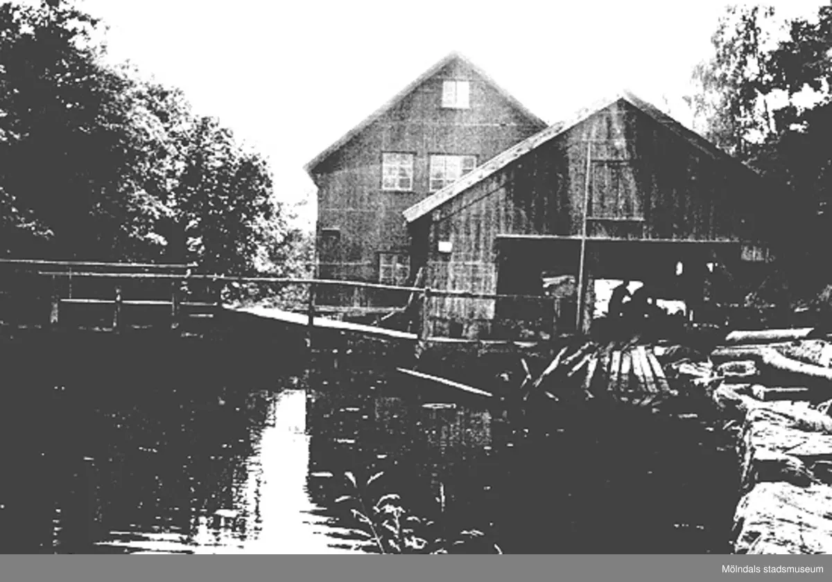 Ålgårdsbacka kvarn, okänt årtal. Sågverket ses i förgrunden och kvarnen bakom. Det kallades i äldre tid i Lindome för "sågkvarn".
