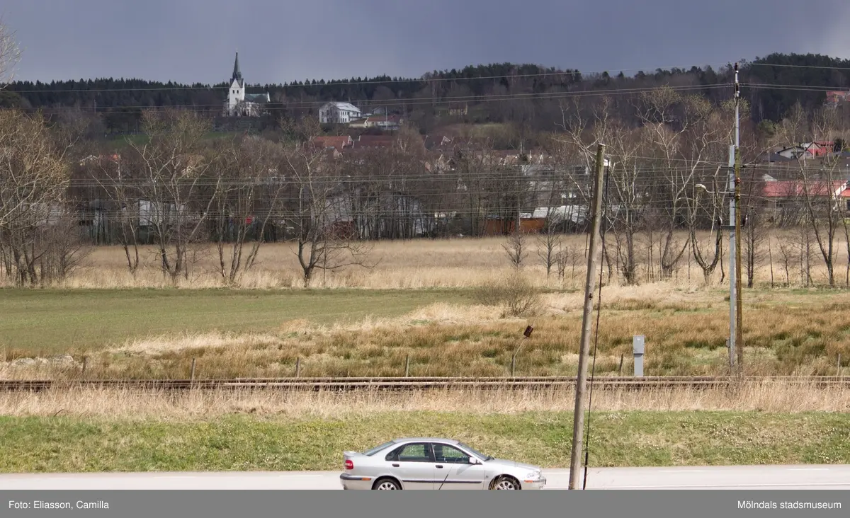 Vy från Kjellbergska Vägen i Fågelsten över Gamla Riksvägen mot Ranntorp, Kyrkängen och Lindome kyrka i bakgrunden. Nedanför kyrkan fanns tidigare stora sandhålor och gårdsbruksmark. Sandhålorna har fyllts igen och marken är alltjämt öppen men brukas inte längre för odling.