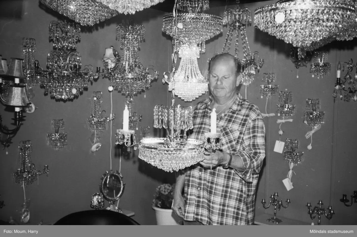 Företaget Nordisk Metallkonst i Annestorp, Lindome, år 1983. "Villy Nord tar sig en titt på sina egenhändigt gjorda kristallampor."