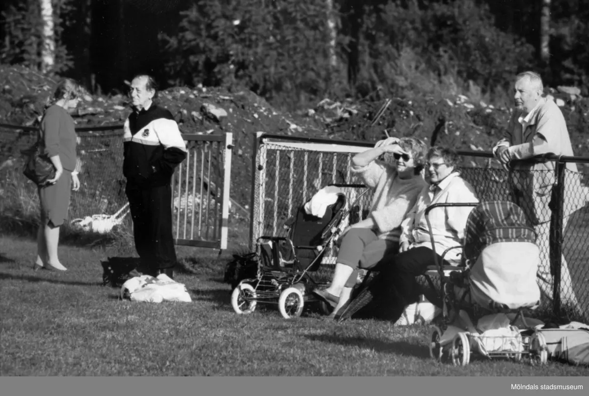 Olle Andersson (sportklädd) och några åskådare vid en fotbollsmatch i Lindome, omkring 1985.