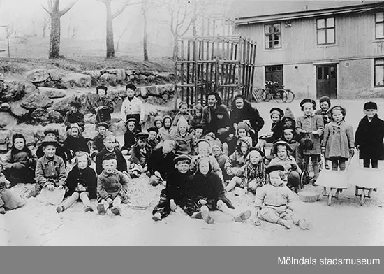 Bosgårdens barnträdgård, 1939. Barnträdgårdsgrupp (Kindergarten) med två lekfröknar ute vid sandlådan och klätterställningen.