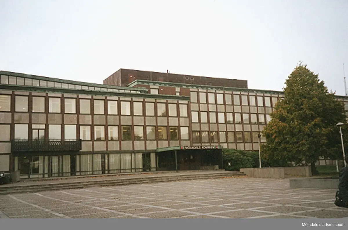 Mölndals stadshus vid Stadshusplatsen. Mölndalsbro i dag - ett skolpedagogiskt dokumentationsprojekt på Mölndals museum under oktober 1996. 1996_1320-1337 är gjorda av högstadieelever från Åbyskolan 8A, grupp 5. Se även 1996_0913-0940, gruppbilder på klasserna 1996_1382-1405 och bilder från den färdiga utställningen 1996_1358-1381.