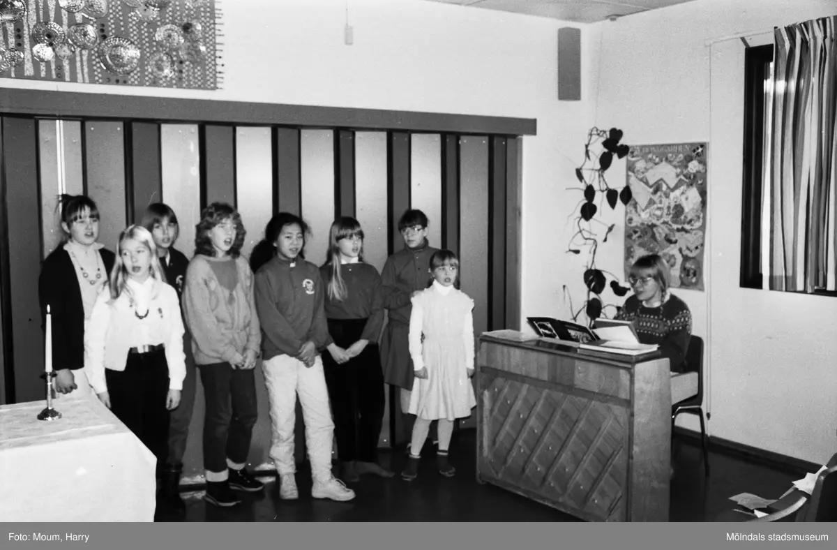 En flickkör sjunger vid gudstjänst i Rävekärrsskolan i samband med att man tar första spadtaget till Fågelbergskyrkan i Rävekärr, år 1984.