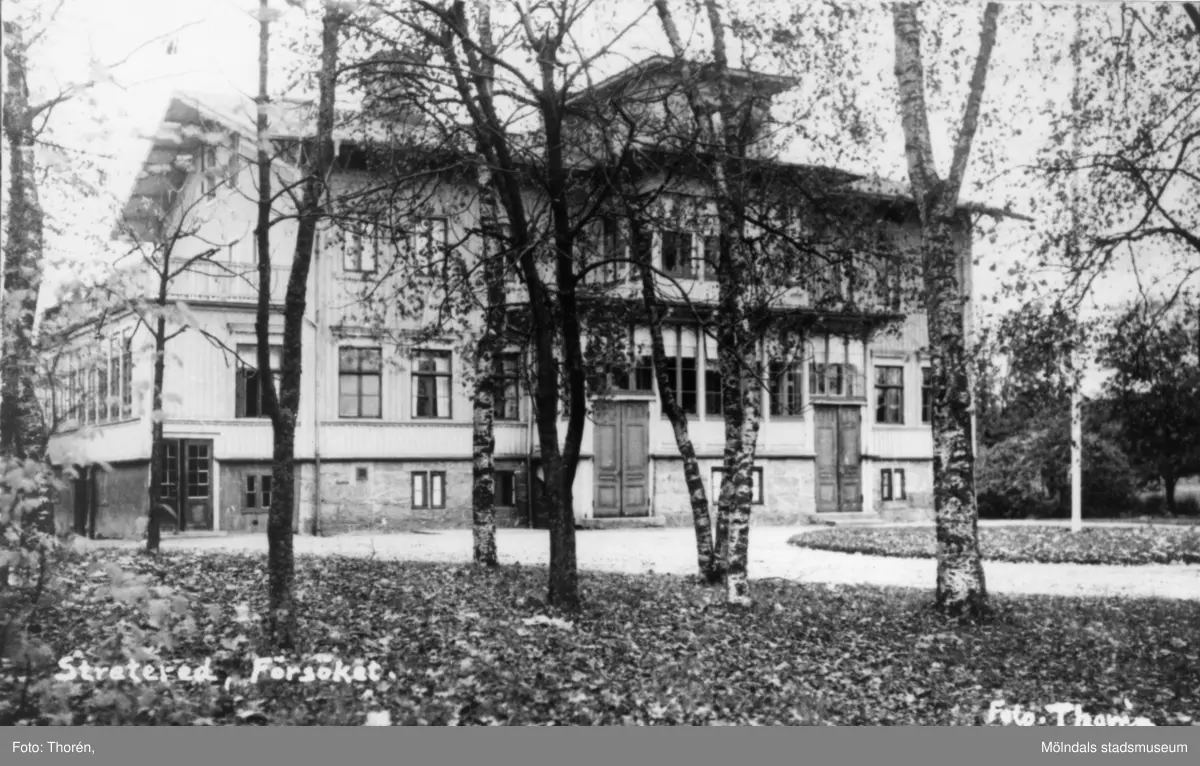 Gamla förskolan "Försöket" på Streteredshemmet i Kållered. Flyttat till Stretered från Södra Vägen, Getebergsäng. Fick stå kvar tills efter kriget p.g.a. utrymningsplanen. Stenfoten ligger i grustaget, sjöbacken mot Tulebo.