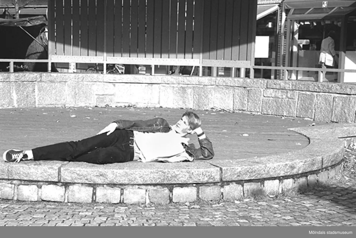 En kille ligger på stenmuren som är placerad framför scenen på Alberts torg. Mölndalsbro i dag - ett skolpedagogiskt dokumentationsprojekt på Mölndals museum under oktober 1996. 1996_1005-1023 är gjorda av högstadieelever från Kvarnbyskolan 9A, grupp 6. Se även 1996_0913-0940, gruppbilder på klasserna 1996_1382-1405 samt bilder från den färdiga utställningen 1996_1358-1381.