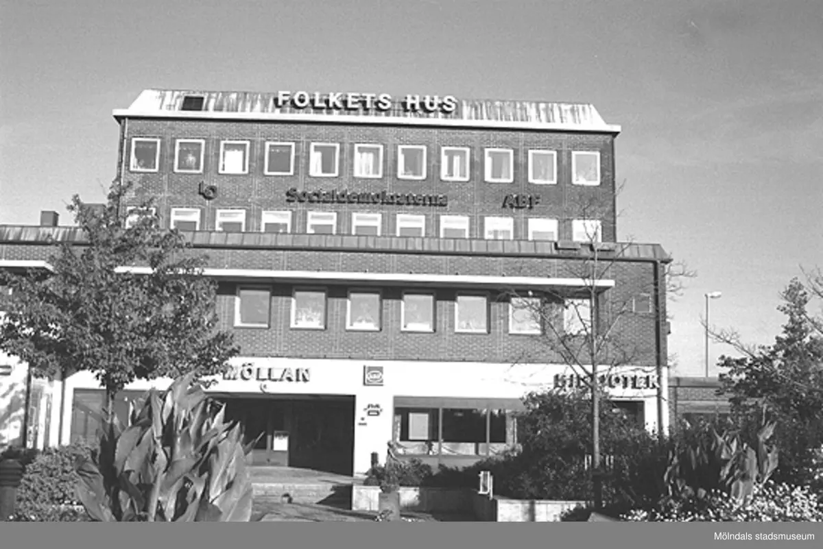 Folkets hus med planteringar framför. Mölndalsbro i dag - ett skolpedagogiskt dokumentationsprojekt på Mölndals museum under oktober 1996. 1996_1042-1051 är gjorda av högstadieelever från Kvarnbyskolan 9C, grupp 2. Se även 1996_0913-0940, gruppbilder på klasserna 1996_1382-1405 samt bilder från den färdiga utställningen 1996_1358-1381.