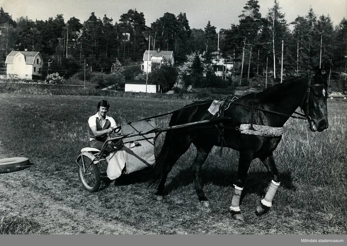 Tommy Rosberg. hästägare och amatörtränare 1976. Även känd som bandyspelare i Ale-Surte. På bilden drögar man, vilket är ett träningssätt som innebär att en vikt placeras bak på sulkyn för att ge hästen ett motstånd.