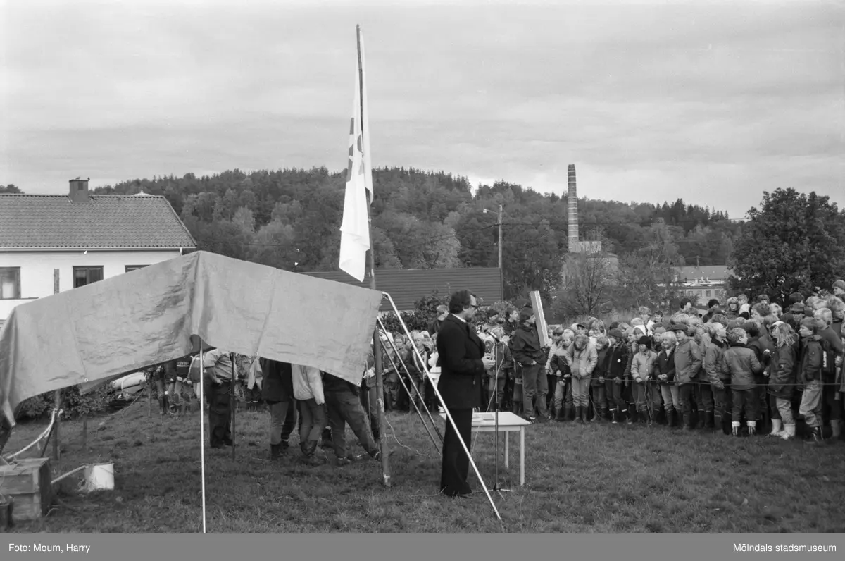 Annestorpsdalens scoutkår anordnar distriktstävlingar från scoutgården vid Konditorivägen i Lindome, år 1983. Mats Oreklev håller i andakten.
