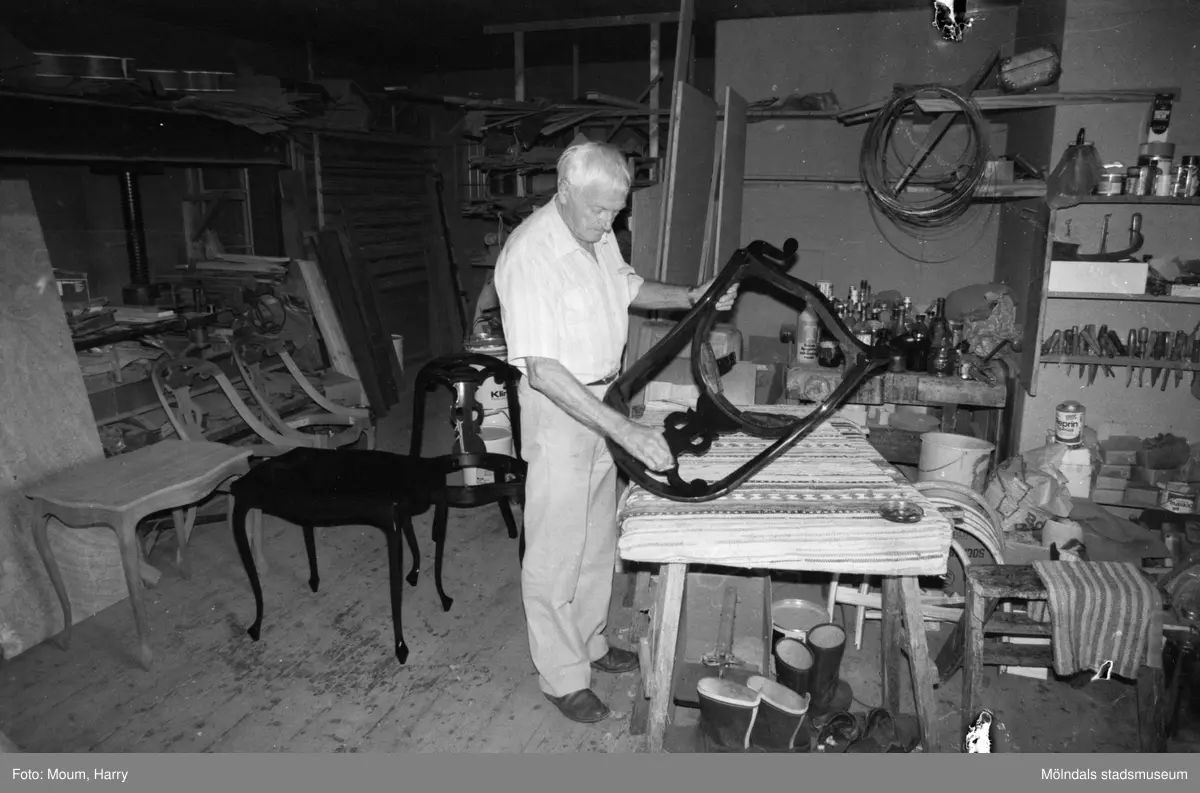 Lindomesnickaren William Andersson i sin verkstad vid Barnsjön i Lindome, år 1983. "Visst är dom formfulländade. William Anderssons Göteborgsstolar."