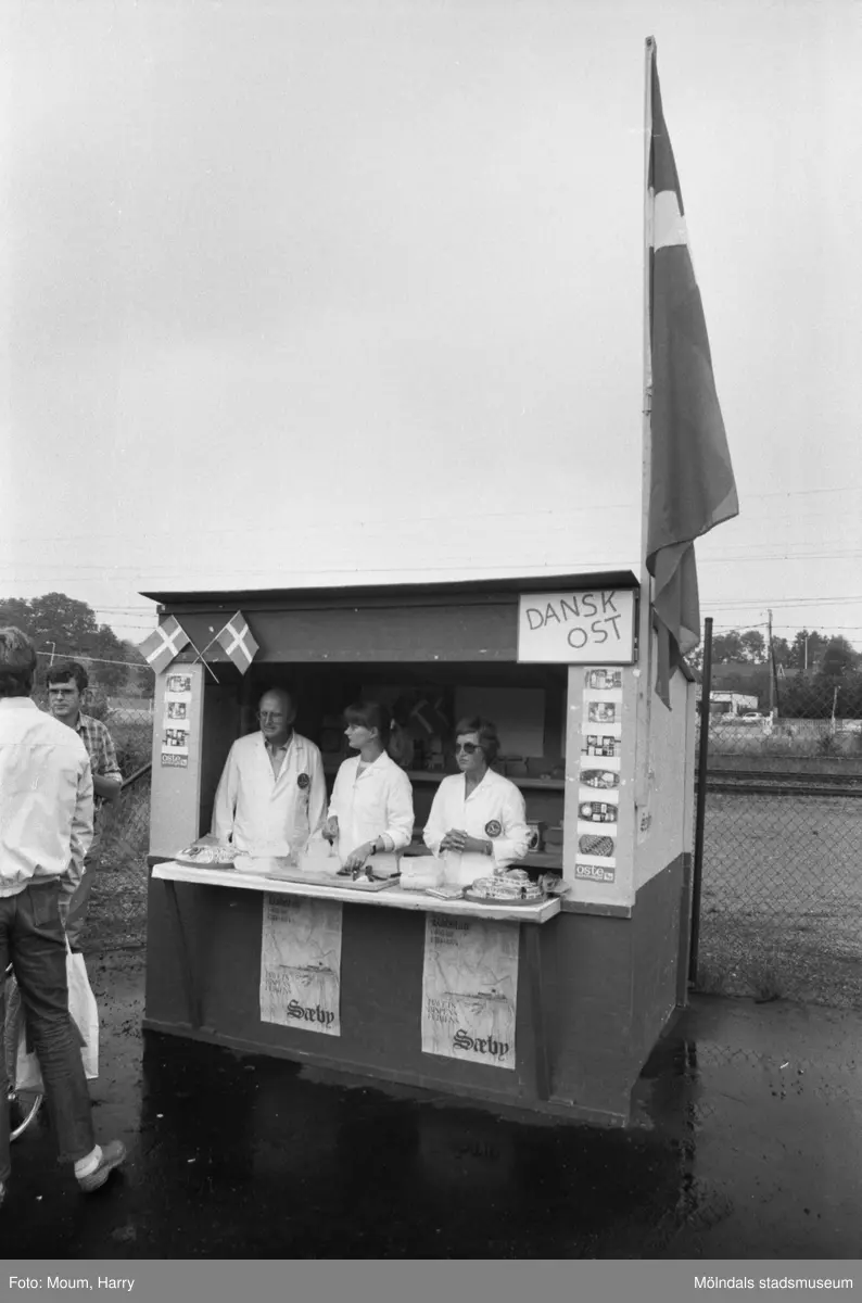 Lindome Lions Club anordnar loppmarknad vid Lindome station, år 1983. Försäljning av dansk ost.