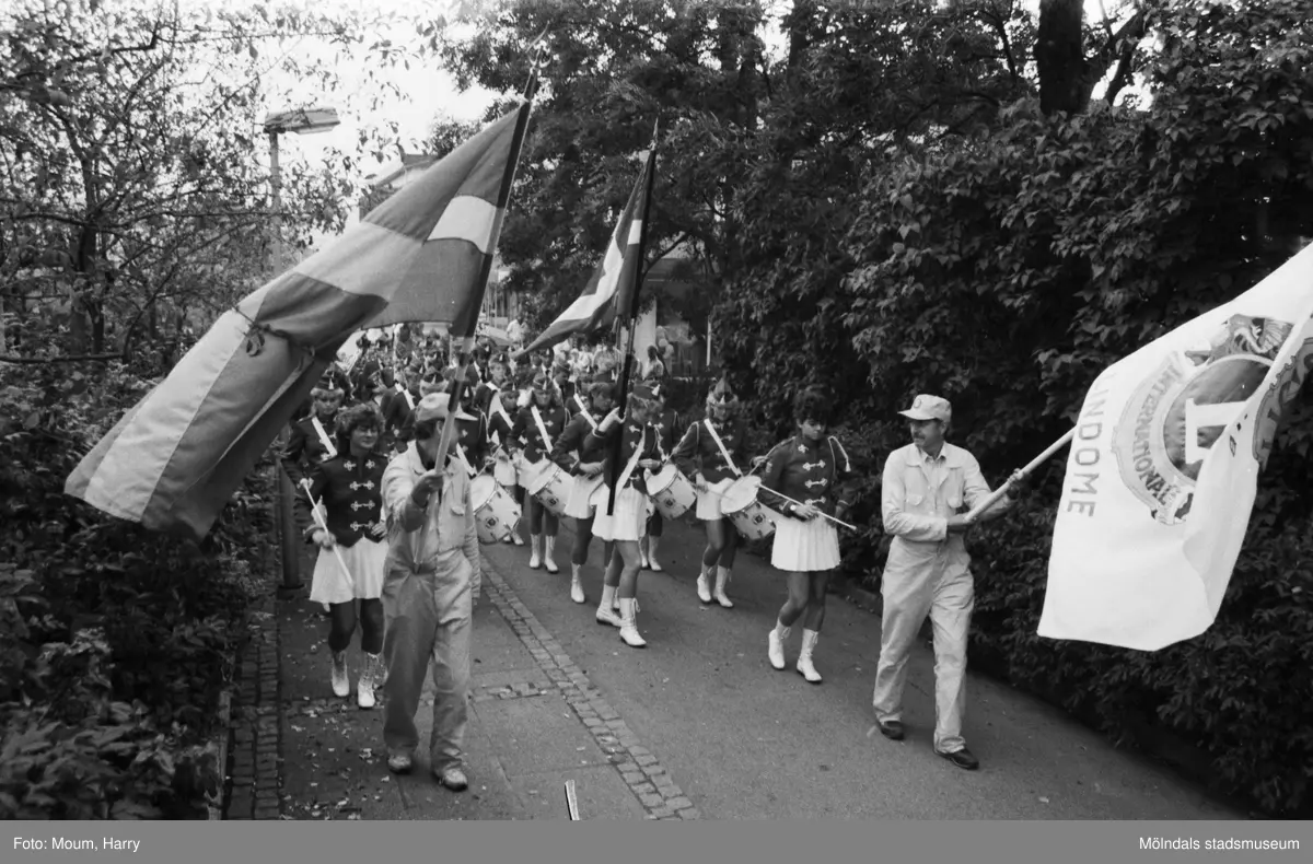 "Saeby's Garden på marsch mot Lions traditionella loppmarknad i Lindome." Almåsgången i Lindome, år 1983.