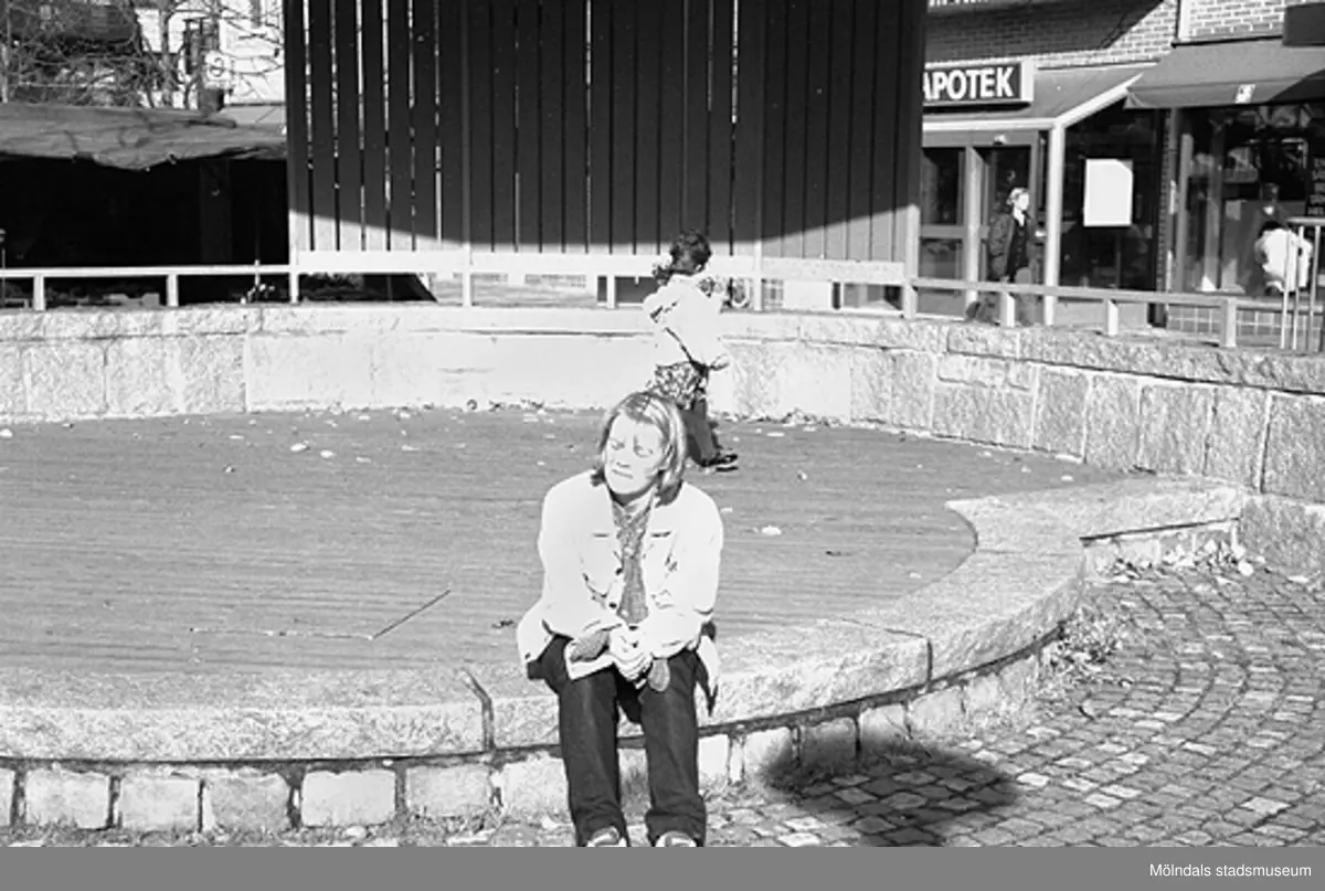 En tjej sitter på en stenmur vid Alberts torgs scen. Mölndalsbro i dag - ett skolpedagogiskt dokumentationsprojekt på Mölndals museum under oktober 1996. 1996_0991-1004 är gjorda av högstadieelever från Kvarnbyskolan 9A, grupp 5. Se även 1996_0913-0940, gruppbilder på klasserna 1996_1382-1405 samt bilder från den färdiga utställningen 1996_1358-1381.
