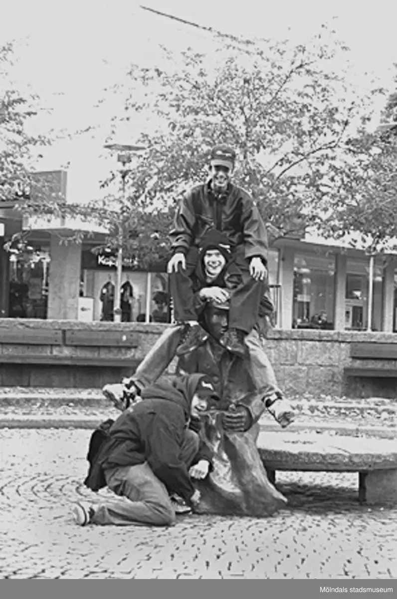 Ungdomar runt skulpturen Albert på Mölndals torg. Mölndalsbro i dag - ett skolpedagogiskt dokumentationsprojekt på Mölndals museum under oktober 1996. 1996_1024-1041 är gjorda av högstadieelever från Kvarnbyskolan 9C, grupp 1. Se även 1996_0913-0940, gruppbilder på klasserna 1996_1382-1405 samt bilder från den färdiga utställningen 1996_1358-1381.