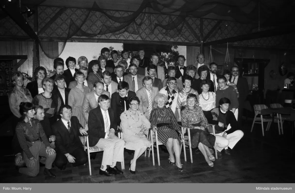 Skolklass från Sinntorpsskolan 25-årsjubilerar med sina lärare på Kållereds Värdshus, år 1983. "Lärarna John Erik Sjögren, Märit Åshammar, Elsa Plate och Berit Sahle framför sina gamla elever."