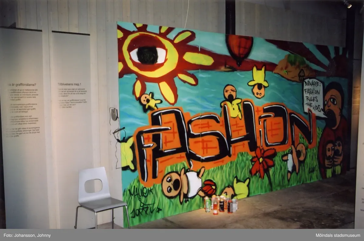 Klotter på en fönsterruta. Från utställningen "Alltså finns jag" som handlade om graffitikultur. Pågick 25 januari - 25 maj 2003 på Mölndals Museum (senare Mölndals stadsmuseum). Produktionen var ett samarbete mellan Mölndals Museum, Vitlycke museum, Bohusläns museum, Västergötlands museum och Konstkonsulenterna i Västra Götalandsregionen.