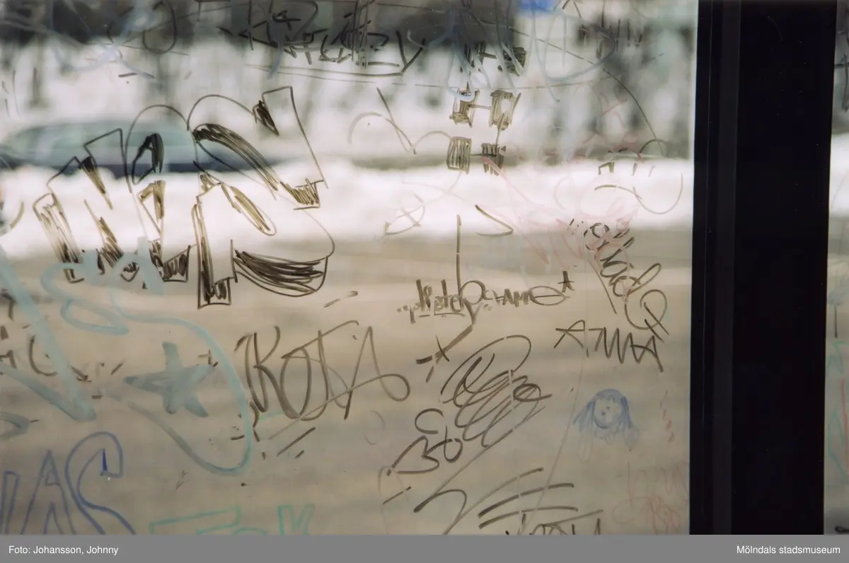 Klotter på en fönsterruta. Från utställningen "Alltså finns jag" som handlade om graffitikultur. Pågick 25 januari - 25 maj 2003 på Mölndals Museum (senare Mölndals stadsmuseum). Produktionen var ett samarbete mellan Mölndals Museum, Vitlycke museum, Bohusläns museum, Västergötlands museum och Konstkonsulenterna i Västra Götalandsregionen.