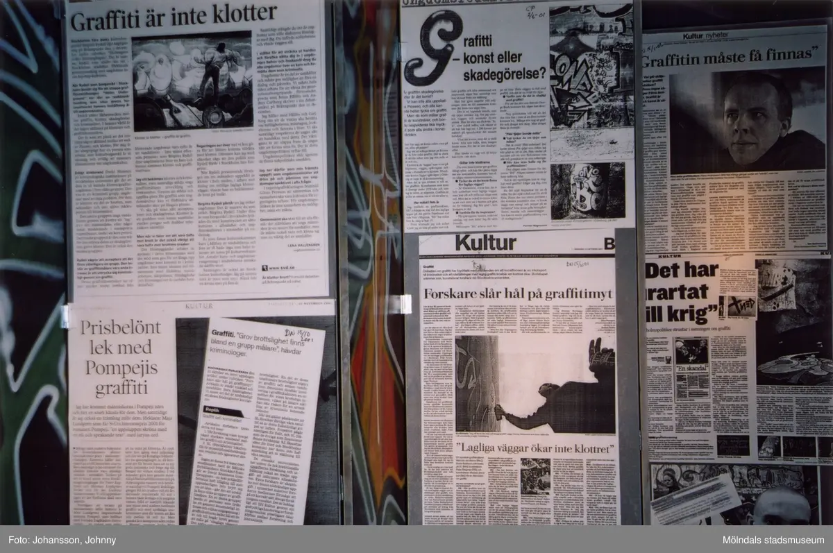 Tidningsurklipp. Från utställningen "Alltså finns jag" som handlade om graffitikultur. Pågick 25 januari - 25 maj 2003 på Mölndals Museum (senare Mölndals stadsmuseum). Produktionen var ett samarbete mellan Mölndals Museum, Vitlycke museum, Bohusläns museum, Västergötlands museum och Konstkonsulenterna i Västra Götalandsregionen.