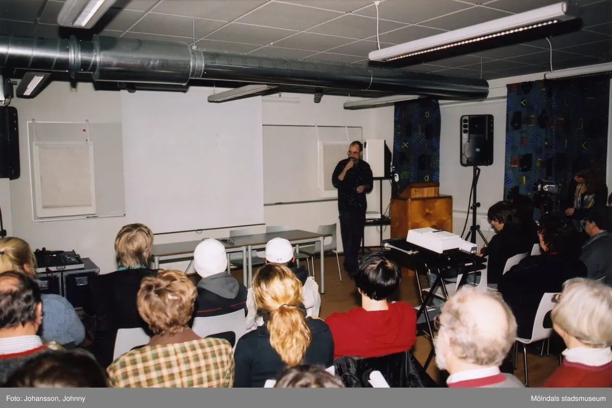 Fil. dr Staffan Jacobsson* håller en föreläsning om graffitikultur i "Stora konferensen" på Mölndals museum, år 2003. I samband med invigningen av graffitiutställningen "Alltså finns jag".