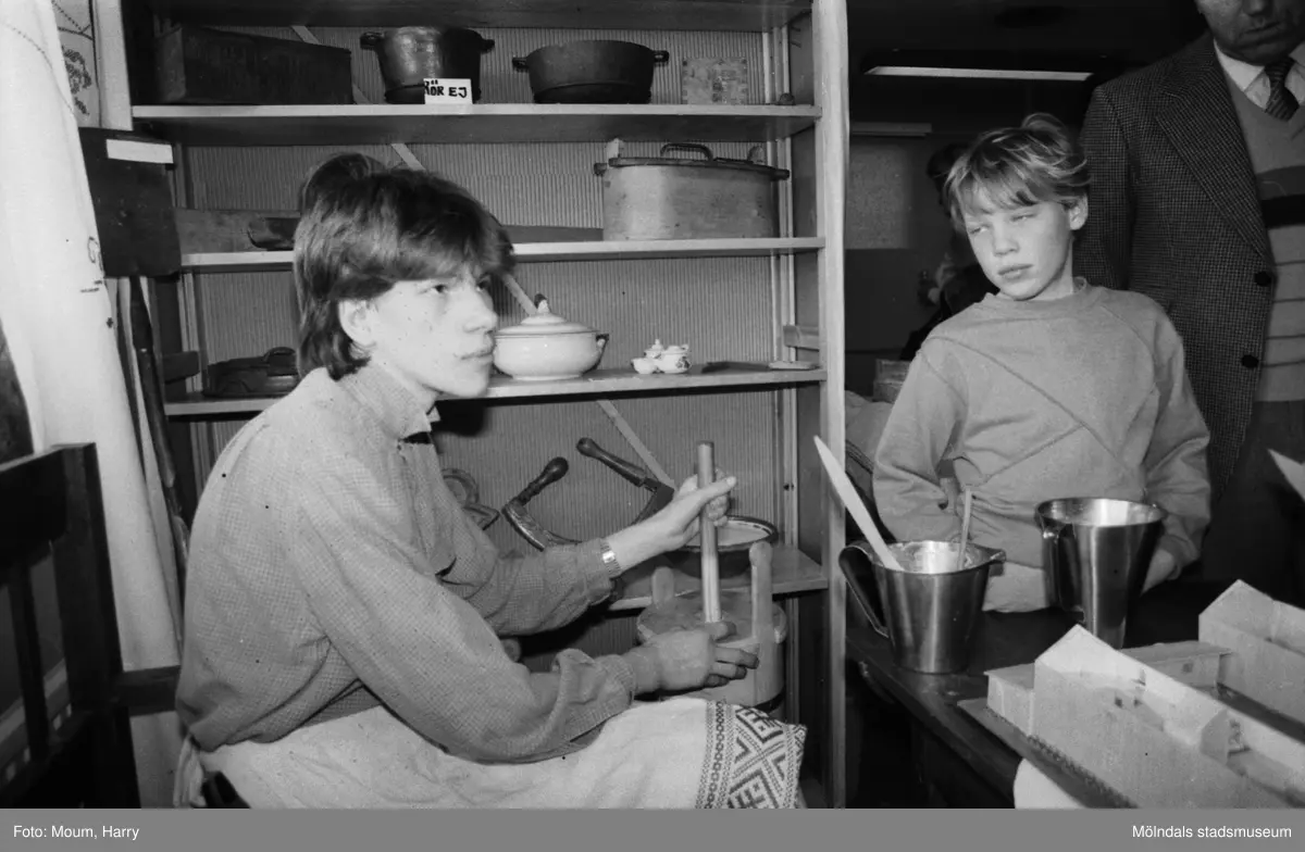 Jonas Hugosson kärnar smör under Lindome kulturdagar på Almåsgården i Lindome, år 1984.