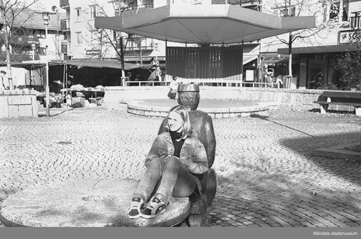 En tjej sitter rygg mot rygg med skulpturen Albert. Mölndalsbro i dag - ett skolpedagogiskt dokumentationsprojekt på Mölndals museum under oktober 1996. 1996_0991-1004 är gjorda av högstadieelever från Kvarnbyskolan 9A, grupp 5. Se även 1996_0913-0940, gruppbilder på klasserna 1996_1382-1405 samt bilder från den färdiga utställningen 1996_1358-1381.