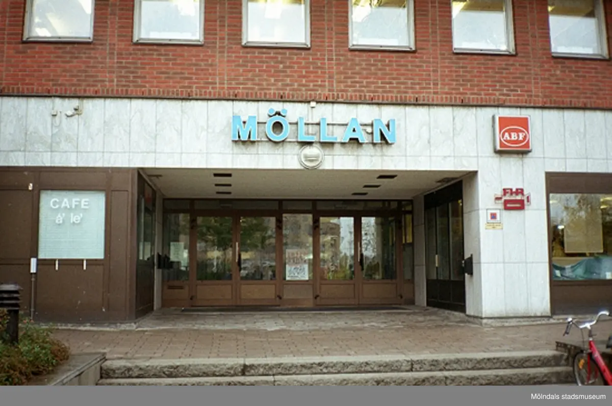 Huvudentréen till Folkets Hus. I byggnaden finns bl.a biiografen Möllan, café, ABF samt bibliotek. Mölndalsbro i dag - ett skolpedagogiskt dokumentationsprojekt på Mölndals museum under oktober 1996. 1996_1227-1245 är gjorda av högstadieelever från Kvarnbyskolan 9D, grupp 6. Se även 1996_0913-0940.