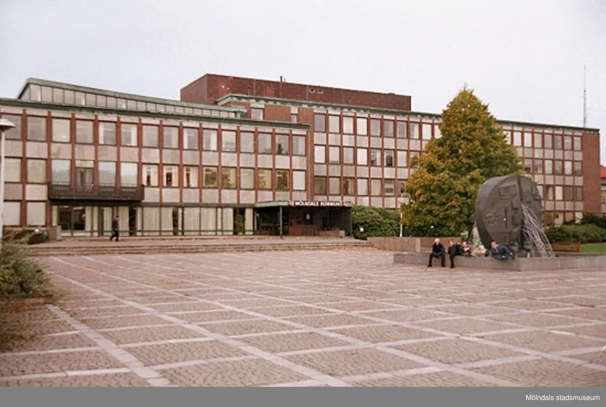 Mölndals stadshus och Stadshusplatsen framför. Mölndalsbro i dag - ett skolpedagogiskt dokumentationsprojekt på Mölndals museum under oktober 1996. 1996_1246-1263 är gjorda av högstadieelever från Åbyskolan 8A, grupp 1. Se även 1996_0913-0940. Gruppbilder på klasserna 1996_1382-1405 och bilder från den färdiga utställningen 1996_1358-1381.