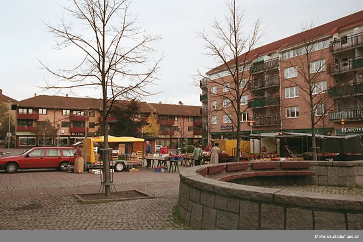 Torghandel på Mölndals torg. Bergmansgatan i fonden. Havskatten 17 till höger. Mölndalsbro i dag - ett skolpedagogiskt dokumentationsprojekt på Mölndals museum under oktober 1996. 1996_1264-1282 är gjorda av högstadieelever från Åbyskolan 8A, grupp 2. Se även 1996_0913-0940, gruppbilder på klasserna 1996_1382-1405 och bilder från den färdiga utställningen 1996_1358-1381.