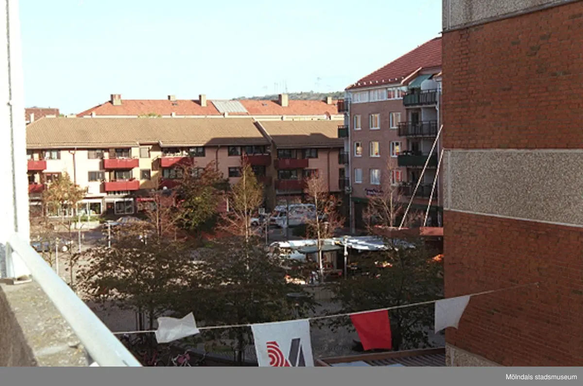 Vy från p-däcker över torget. Medborgargatan ses i fonden. Mölndalsbro i dag - ett skolpedagogiskt dokumentationsprojekt på Mölndals museum under oktober 1996. 1996_1116-1134 är gjorda av högstadieelever från Kvarnbyskolan 9C, grupp 6. Se även 1996_0913-0940, gruppbilder på klasserna 1996_1382-1405 samt bilder från den färdiga utställningen 1996_1358-1381.
