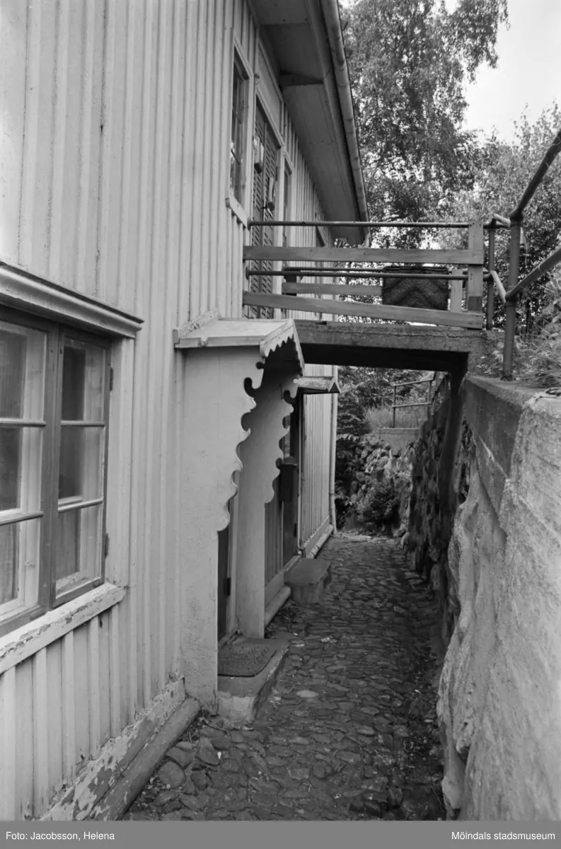 Exteriörbild av bostadshus med en kvarvarande "brygga" på Roten M 18 i Mölndals Kvarnby, 1972.