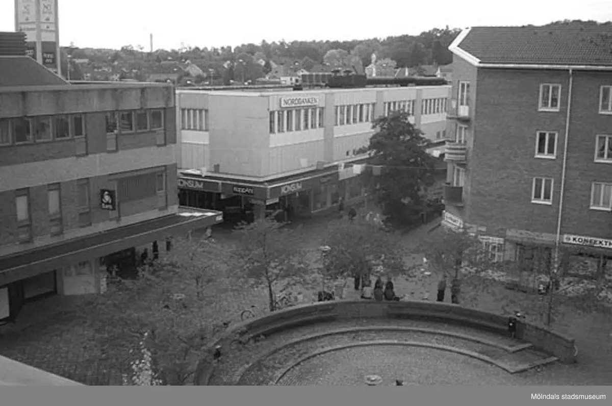 Alberts torg sett från ovan. Mölndalsbro i dag - ett skolpedagogiskt dokumentationsprojekt på Mölndals museum under oktober 1996. 1996_0950-0965 är gjorda av högstadieelever från Kvarnbyskolan 9A, grupp 3. Se även 1996_0913-0940, gruppbilder på klasserna 1996_1382-1405 samt bilder från den färdiga utställningen 1996_1358-1381.