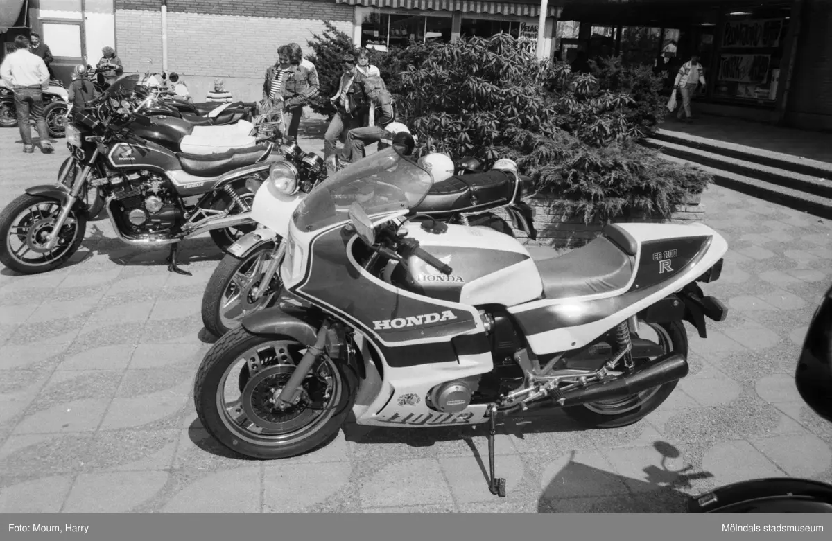 Titel: Kållereds Motorklubb visar upp motorcyklar i Kållereds centrum, år 1984. För mer information om bilden se under tilläggsinformation.