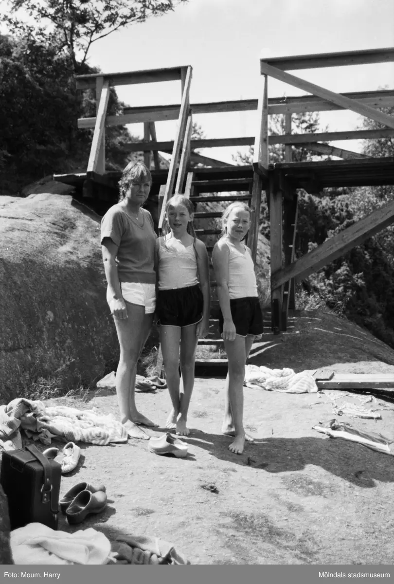 Två flickor och en kvinna vid Bergsjöns badplats i Kållered, år 1983.