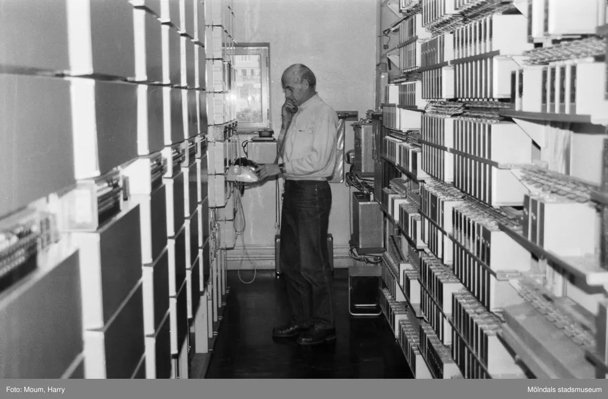 Nya telefonnummer i Kållered och Lindome, år 1984. Stationsreparatör Lars Åke Hansson vid Kållereds telestation. Här och på stationerna i Lindome och Hällesåker skall numren kopplas om.