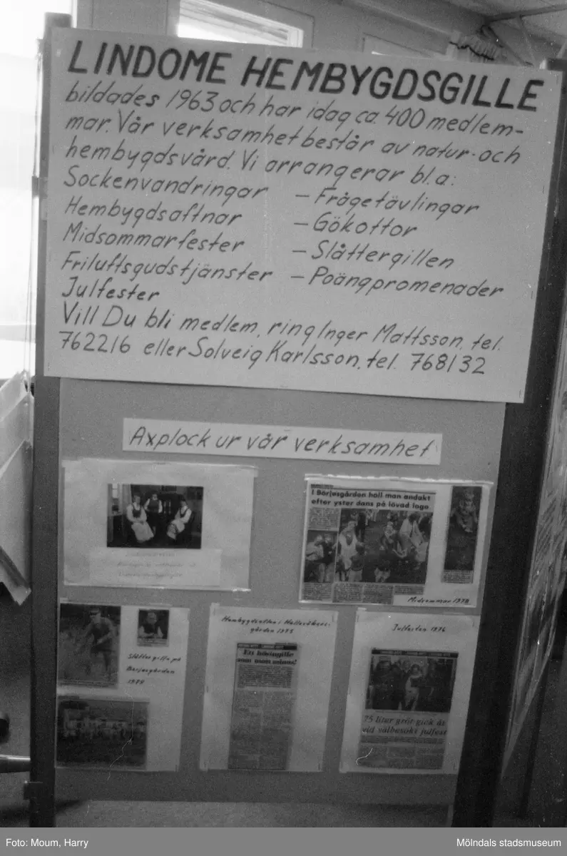 Lindome hembygdsgille ställer ut föremål och fotografier i Lindome bibliotek, år 1984.
