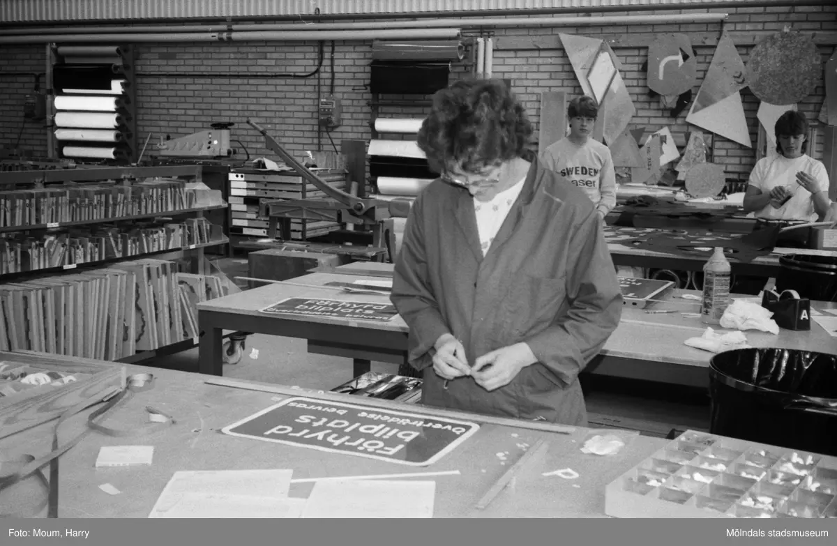 Plast & Plåt vägmärken AB på Bangårdsvägen 49 i Kållered, år 1983. "Teresa Darenvald jobbar med textning av skyltar."