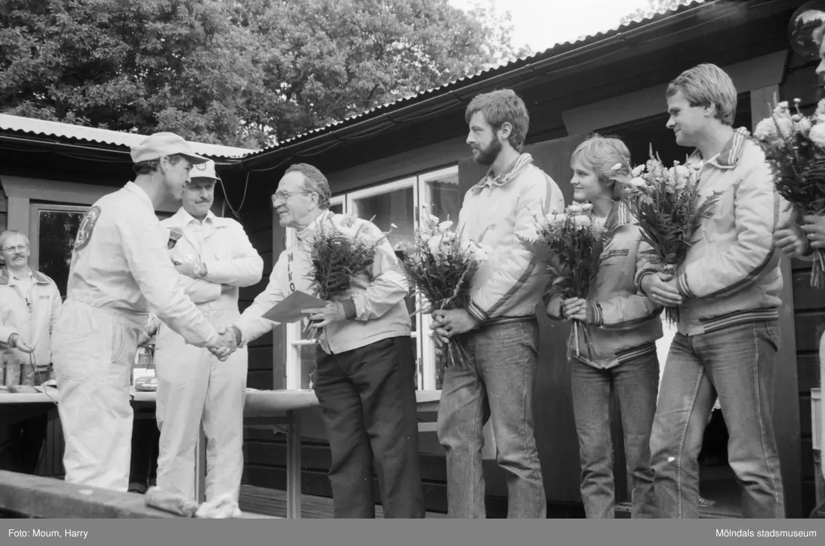 Bågskyttar hyllades med gåva och blommor i Lindome, år 1984. "Ordförande i aktivitetskommitén Kjell Tengelin överlämnar till Nikolaj Babkin LionsClub-gåvan."