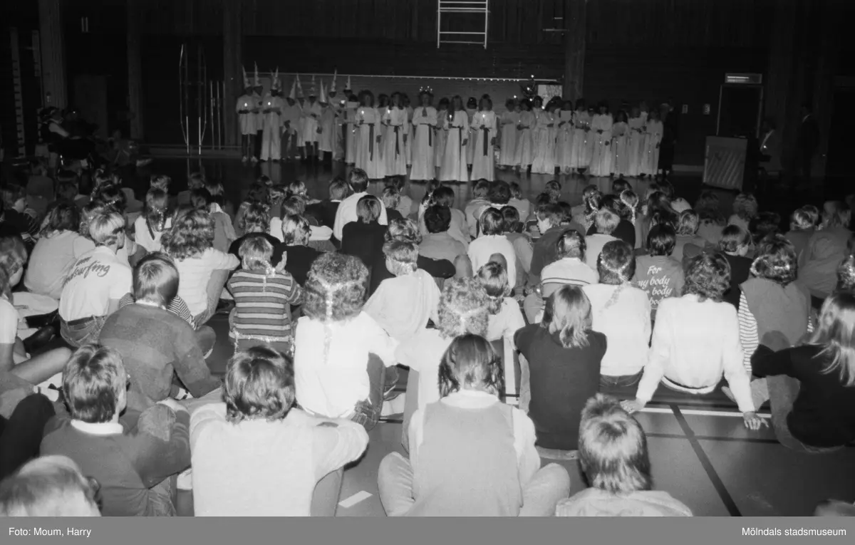 Luciafirande på Ekenskolan i Kållered, år 1983. "Kållereds Lucia Agneta Larsson besökte morgonsamlingen på Ekenskolan i Kållered."