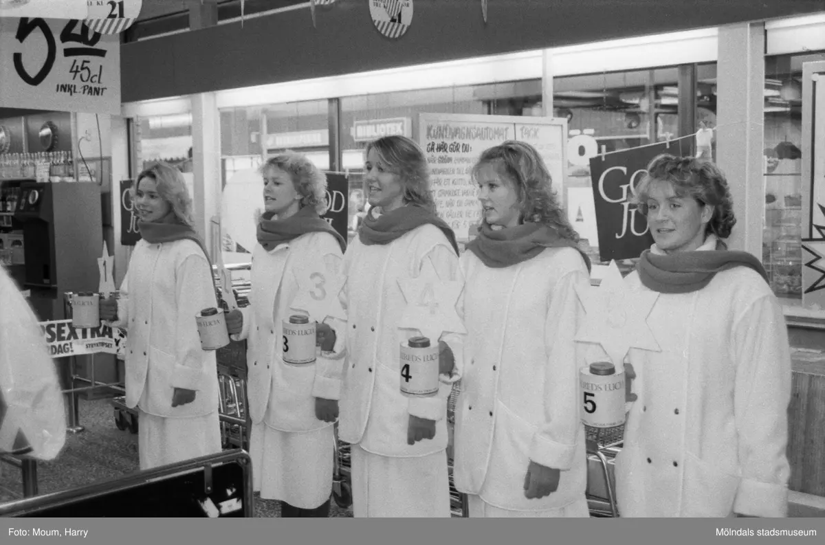 Kållereds luciakandidater presenteras i Kållereds centrum, år 1984.