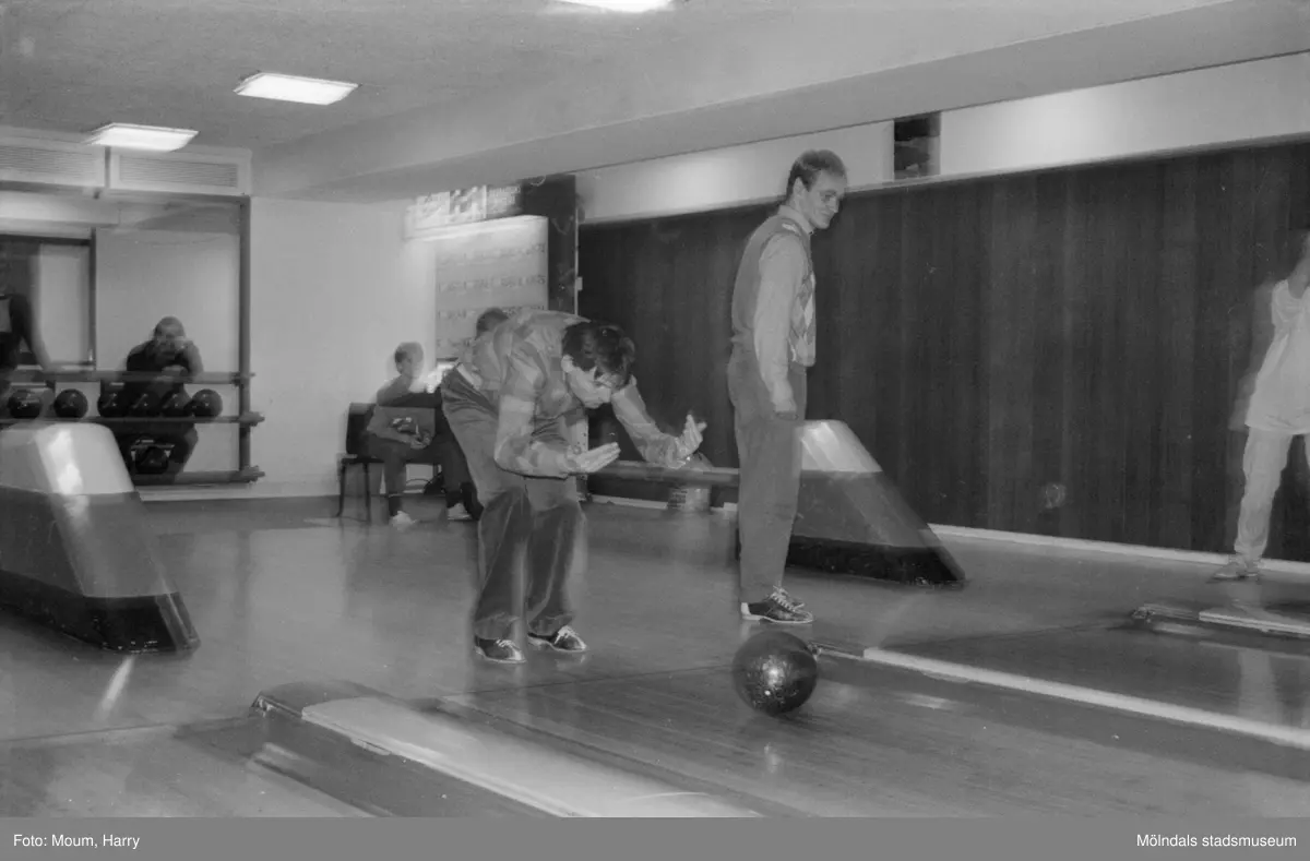 Tävling i bowling för handikappade på Kållereds bowlinghall, år 1984. "Lennart Andersson (närmast) har fått "snurr" på klotet."