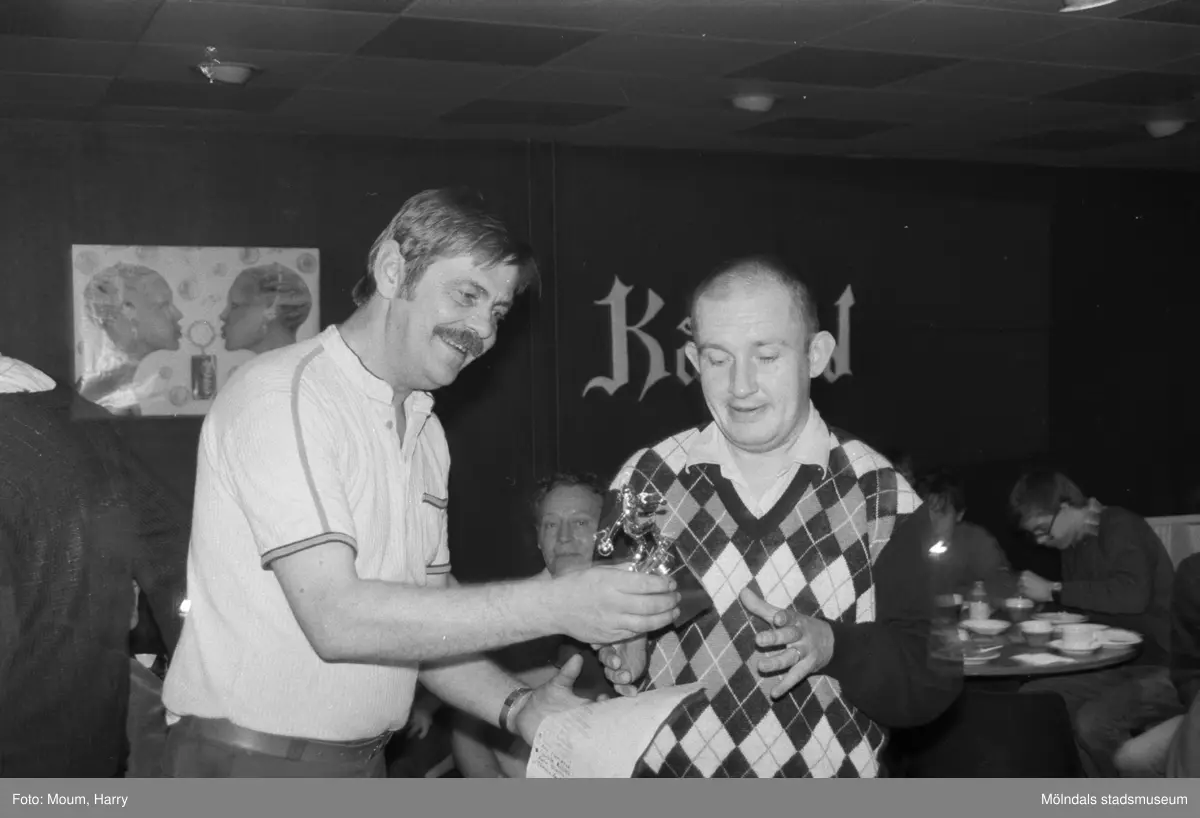 Tävling i bowling för handikappade på Kållereds bowlinghall, år 1984. "Kent Palo delar ut pris till Bengt Kristiansson."
