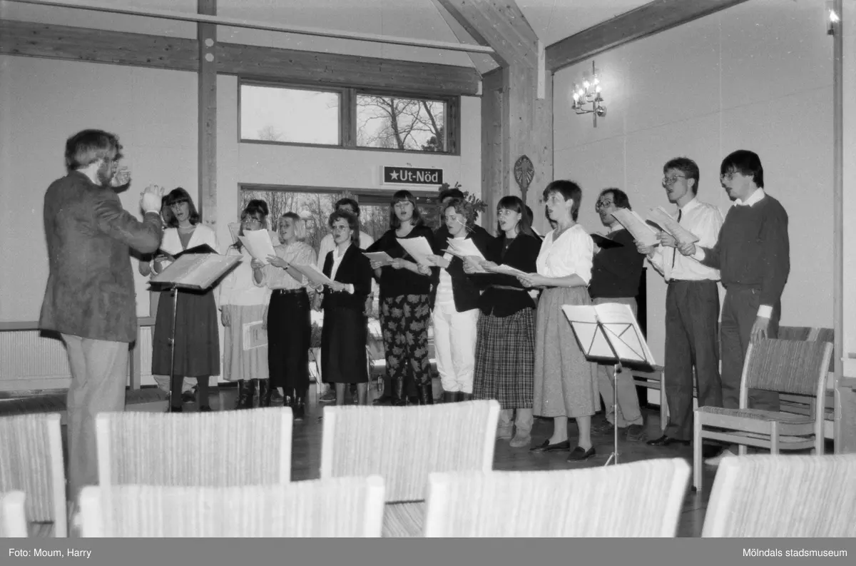 Mölndals vokalensemble har konsert i Apelgårdens kyrka i Kållered, år 1985. "Mölndals Vokalensamble bjöd på stämningsfull konsert."