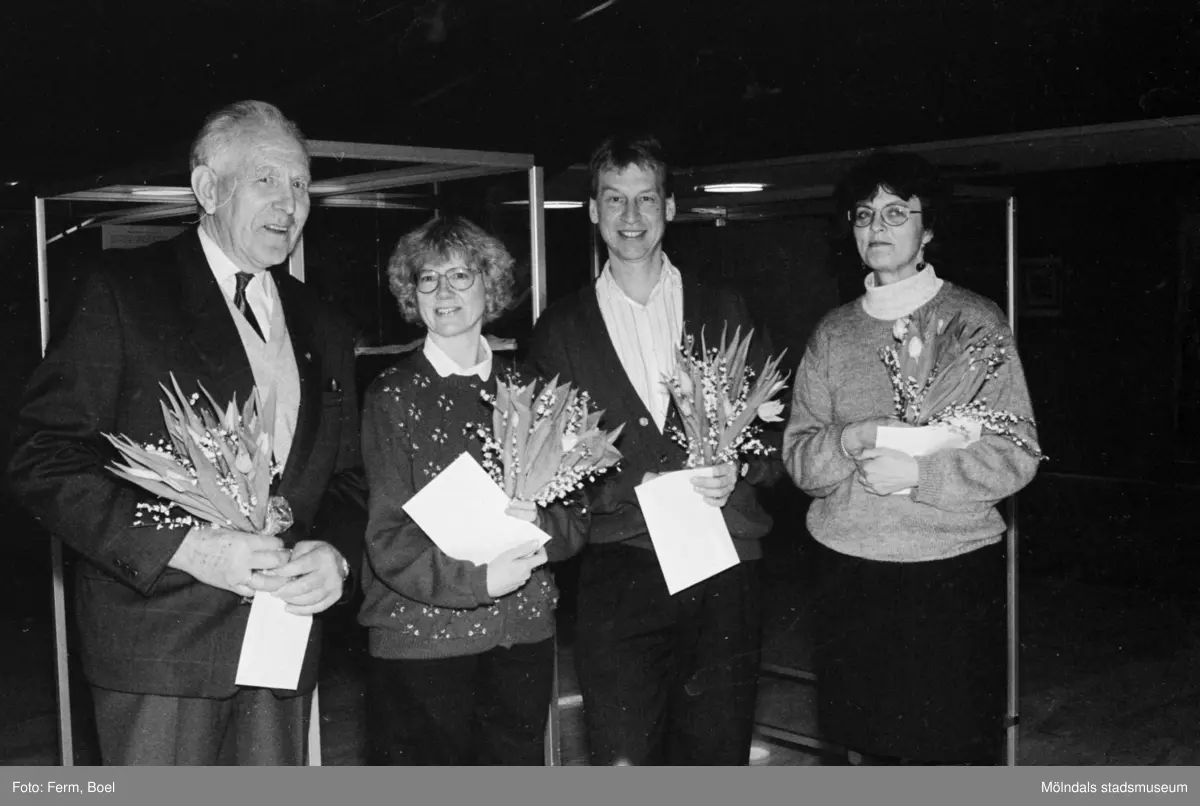 Prisutdelning i Mölndals stadshus vid tävling om Mölndals souvenirer i februari 1992. Längst till vänster står Sven Olof Olsson och längst till höger står konstintendent Bodil Magnusson som vann andrapris med tapetmönstret som hon hade omvandlat till brevpapper/set. Tapeten var upphittat i ett rivningshus i Kvarnbyn. Mannen till vänster om Bodil hade vunnit första pris som var minimodellen av Lindomestolen/Göteborgsmodellen.