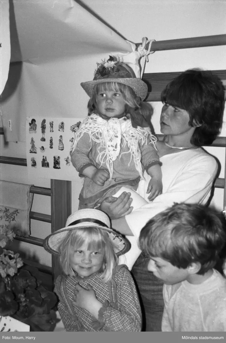 Kultur för barn på Valås förskola i Lindome, år 1984. "Ann Charlotte Wolter hade dagen till ära klätt sig i hatt på Valås barnstuga."