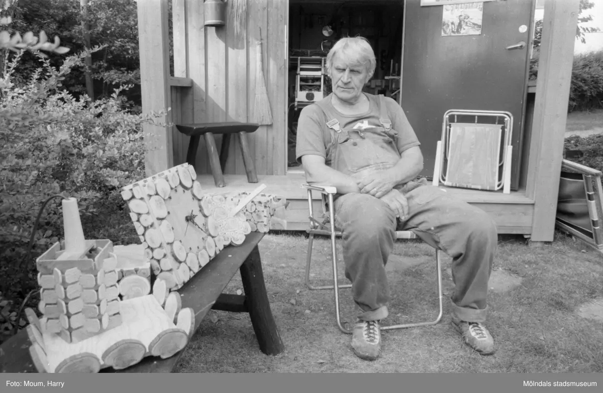 Rune Alfredsson från Kållered slöjdar i ene, år 1984. "Rune Alfredsson beskådar några av de alster han framställt."