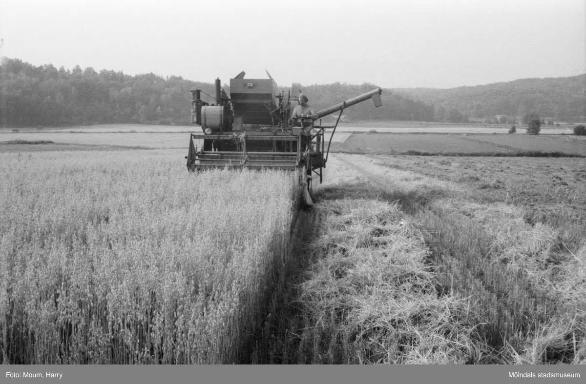 Tore Andersson skördar havre i Lindome, år 1984. "Tore Andersson i Lindome tuggar med sin tröskmaskin solgul havre och lämnar efter sig halm i stora drivor likt guld på fälten."