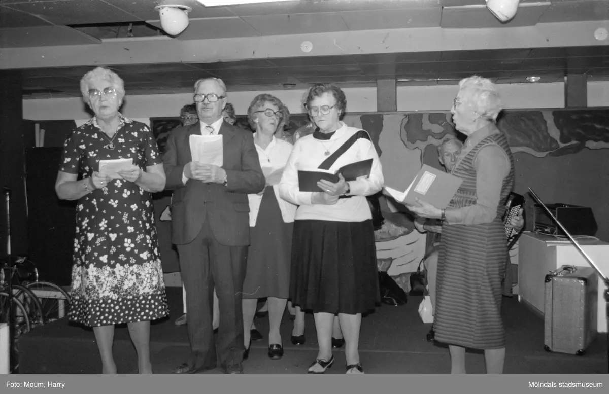 Föreningarnas dag i Kållered, år 1984. Kållereds PRO's sånggrupp. Kvinnan till vänster Kerstin Karlsson och ledaren till höger Sigrid Börjesson, också ordf. i PRO Kållered.