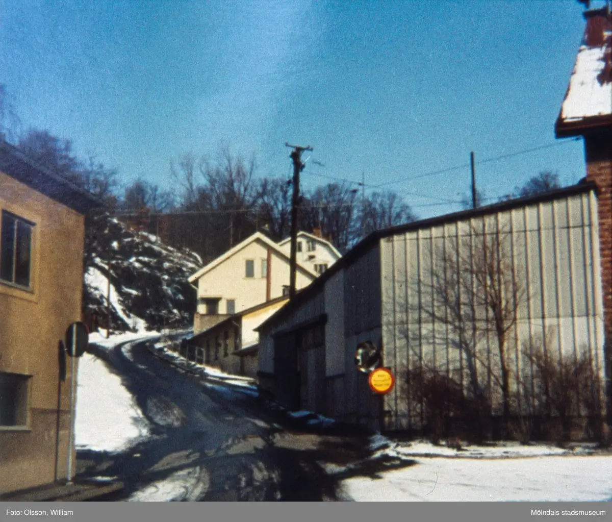 Samuel Norbergsgatan – Friareliden, okänt årtal. En backe svänger åt höger utefter Störtfjället. Fabriksbyggnad ses till vänster och garage samt villor till höger. Elledningar passerar över byggnaderna och det är snö och halka på marken.