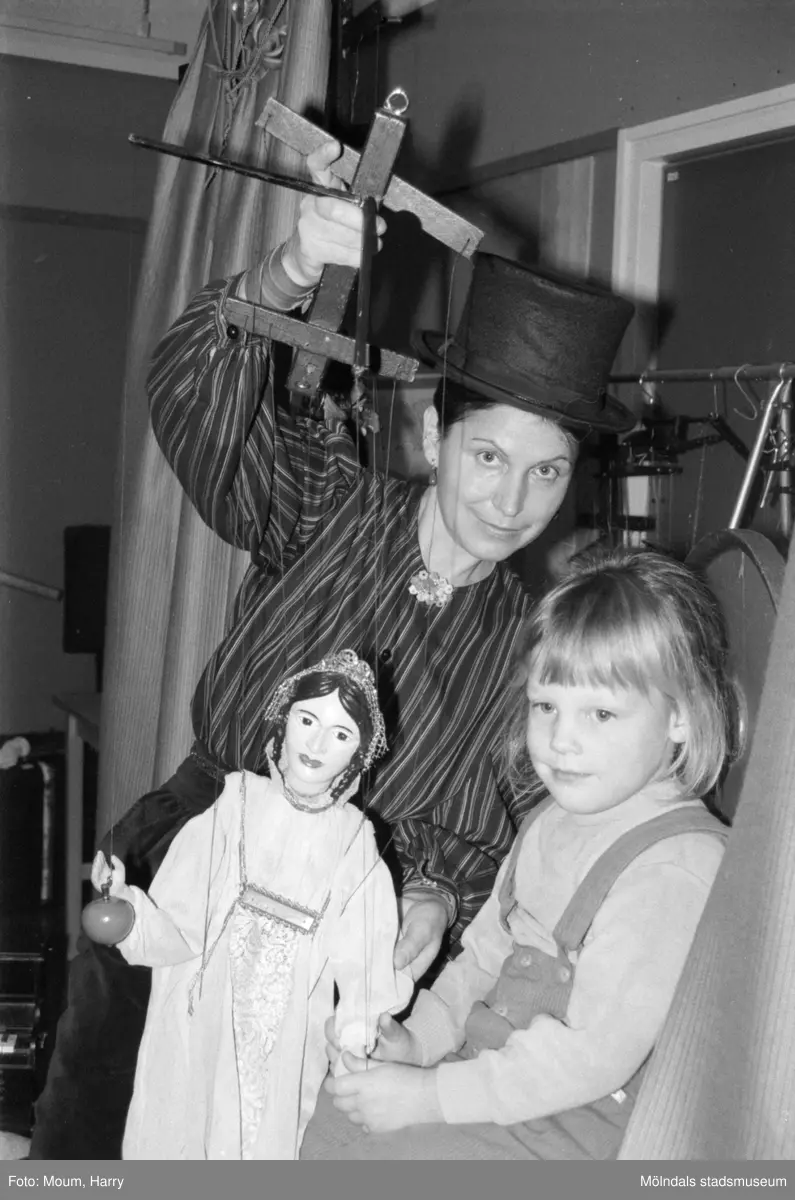 Familjesöndag med diverse aktiviteter på Almåsgården i Lindome, år 1984. "Eliška Recinovà fick hjälp av Anna Erlandsson att ställa i ordning inför marionettföreställningen."