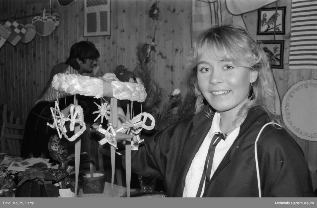 Julbasar i Kållereds Missionskyrka, år 1984. "Annika Larsson hittade en vacker halmdekoration på basaren."